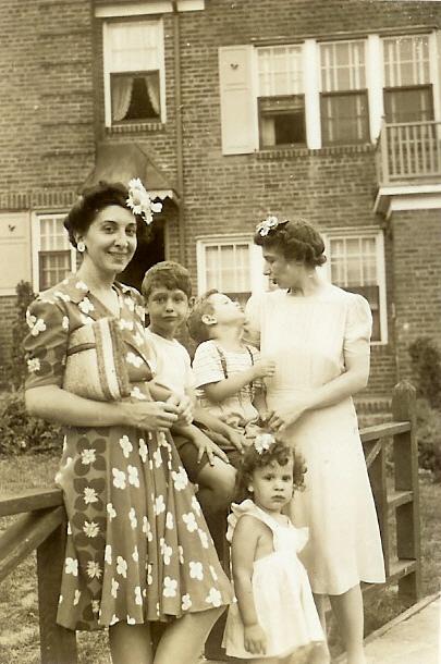 "Attached is a picture I found in an old family album that was taken in front of our Dale Gardens home in the spring of 1943. I think the woman on the left is either Mrs. Korodi or a Mrs. Mintz. If it is Mrs. Mintz, the little girl is her daughter Adele, one of my playmates; if it is Mrs. Korodi, I don't remember whether she had any children. The woman on the right is my mother, Helen Carp, who passed away in 1999 at age 88. Sitting on the fence, looking at my mother, is my brother Joel (who now lives in Portsmouth, New Hampshire), and I am sitting in front of him, looking at the camera."