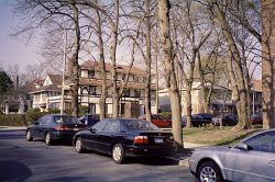 mansion in the 1938 photograph. Although the mansion is long since gone, it has left behind three mementos in the form of brick stanchions which still remain on three of the four corners of the Beverly House property. One stanchion can be seen directly behind the middle car in the 2004 photograph.