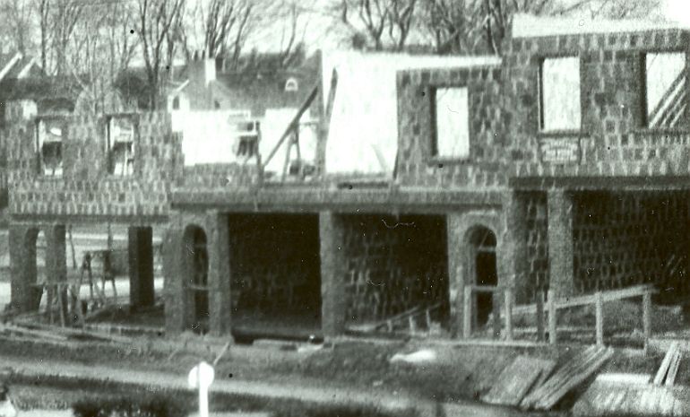 ![]() The photograph to the right shows the Two Story Tudor Building adjacent to the Long Island Rail Road Station under construction c. 1925. If you view the sectional enlargements below you will see the ground floor corner space that went on to become the Bergen Family's pearl knitting business from 1948 to 1960, the Interlude Cafe, the Austin Book Shop and today's Bliss Cafe. Next to it is the hallway in which Kitty Genovese would be attacked almost 40 years later. |
