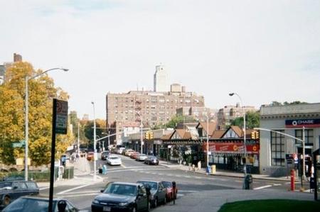 Lefferts Boulevard in Kew Gardens, NY. The Shellball Apartment House in the background dominates the skyline.