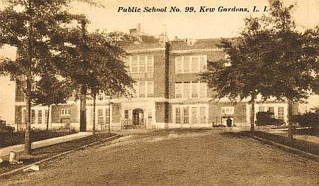 When Kew Gardens was first subdivided, no land was set aside for a school. The first P.S. 99 was a portable wooden school house on Cuthbert Road. In 1915, Alrick Man proposed a site on the east side of Kew Gardens Road at Augustine (83rd) Avenue. Between 1920 and 1923, the Board of Education suggested a number of alternative sites - the Forest Hills side of Union Turnpike, the east side of Lefferts Boulevard, Forest Park on Park Lane, and Quentin Street (80th Road) near Park Lane - all of which were opposed by the Community. In January, 1923, the City's Board of Estimate finally approved the very site Man had suggested 8 years earlier. P.S. 99 opened in 1924.
