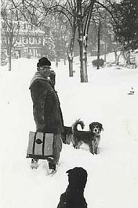 Austin Book Shop owner, Bernard Titowsky, on his way to work after the February 1978 blizzard. The house in the background is the same one seen in the last slide.